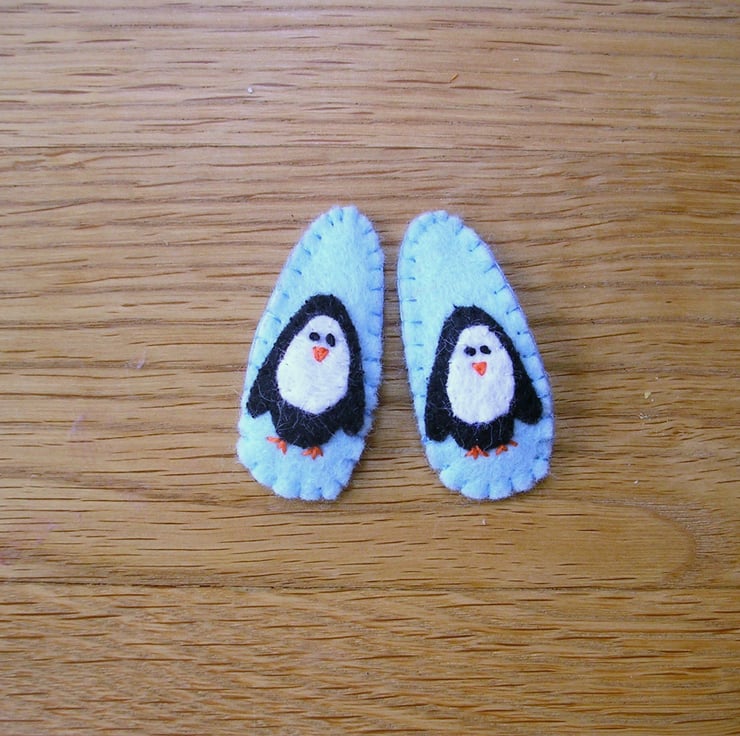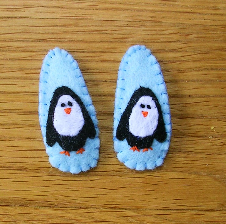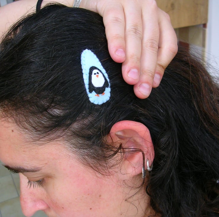 These obscenely cute hairclips feature a wee penguin design on an ice-blue felt background. They are securely stitched around bendy metal snap hair grips so they stay put, and are suitable for children as well as adults. They measure 4cm in length.