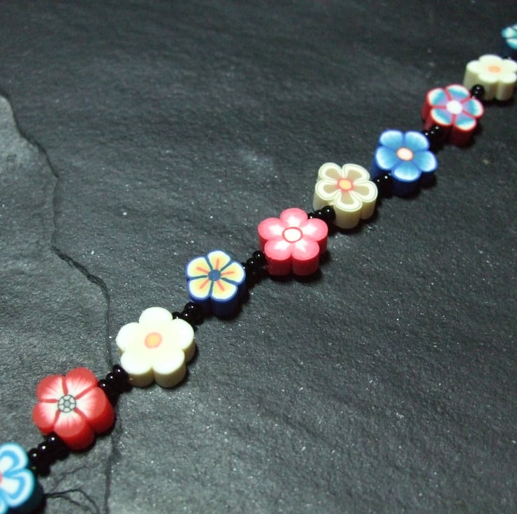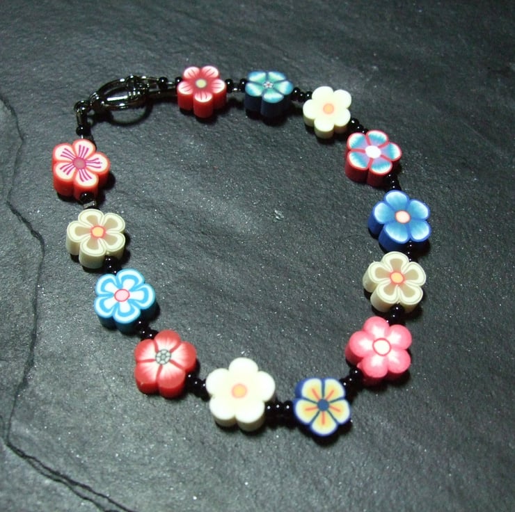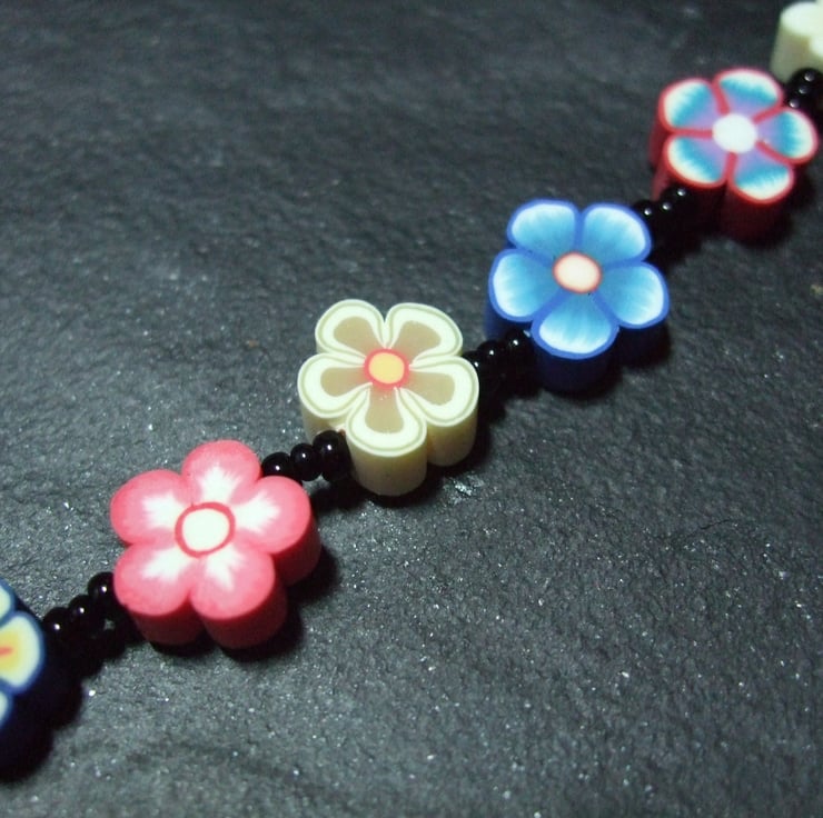 An exclusive, one of a kind bracelet designed to celebrate the Royal Jubilee, this cute, whimsical wristwear from the Kitsch Creations Jubilee Collection is lovingly constructed using miniature floral-themed polymer clay canes in carefully selected patriotic shades of red, white and blue off-set to dramatic effect with the simplest black seed beads and high quality black metal jewelry findings.