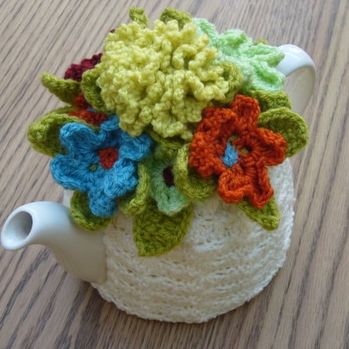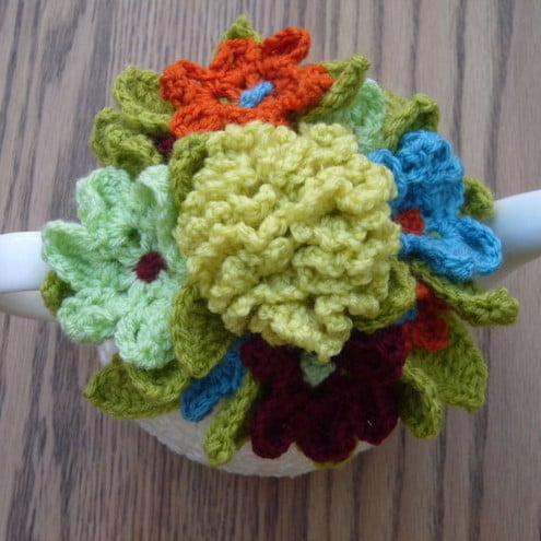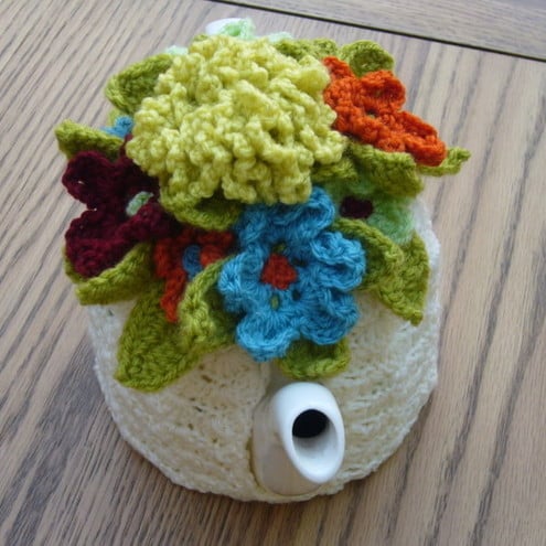 The cosy has been handmade using good quality yarn in cream. The top of the cosy is decorated with a large crochet carnation in mustard with four green leaves. Around the edges of the carnation are four individual flowers in light green, blue, orange and maroon all with green leaves. In between these flowers are very pretty little flowers in contrasting colours with crochet bobble centres.