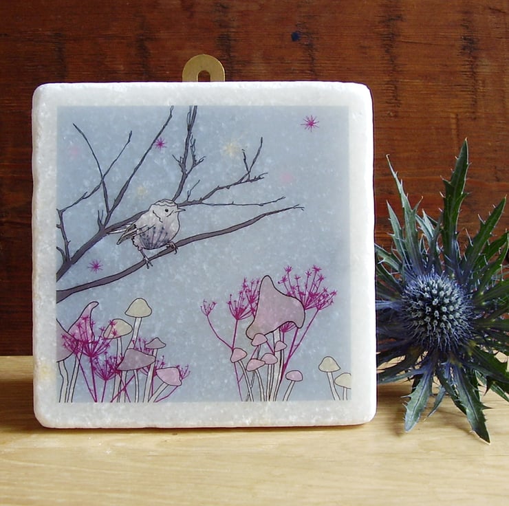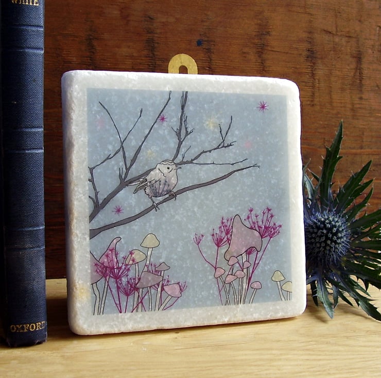 White marble tile featuring an original littlebirdy design to hang on your wall!