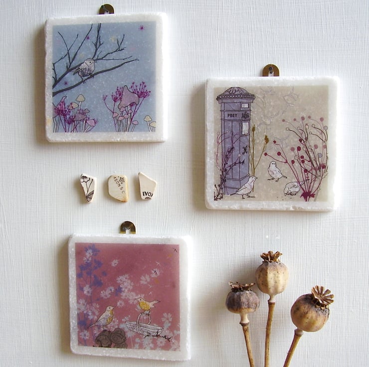 My design is then printed onto a special decal paper which is carefully applied to a white marble tile. I have then glued a small brass mirror plate to the back so you easily hang the tile on the wall (nail not supplied) and applied layers of varnish for extra protection.