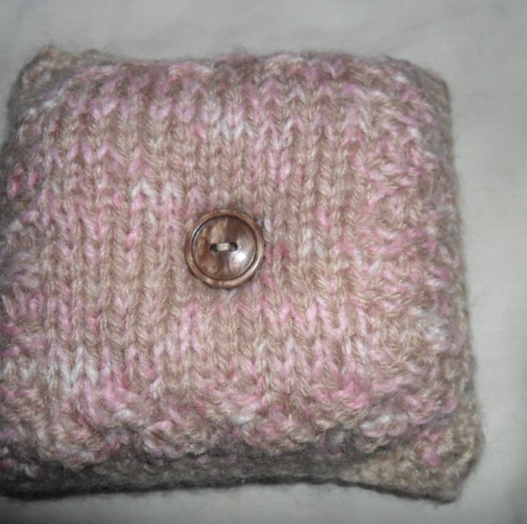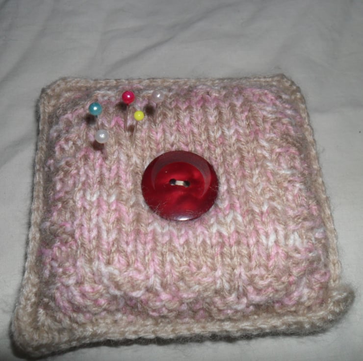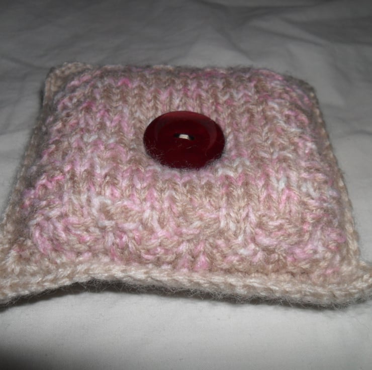 This little pin cushion is hand knitted in stocking stitch and double moss stitch in mix of pink and beige acrylic yarn. I have crocheted the edge in Beige to frame it. The pin cushions, stuffing is held inside a cotton inner lining. I have sewn a large retro red button in the centre and a small beige/fawn button on the reserve side.