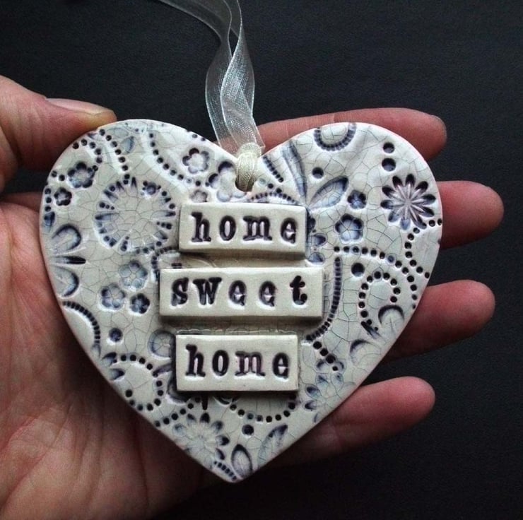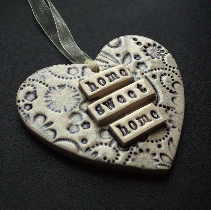 This ceramic heart is made from white earthenware clay and decorated with the words Home Sweet Home