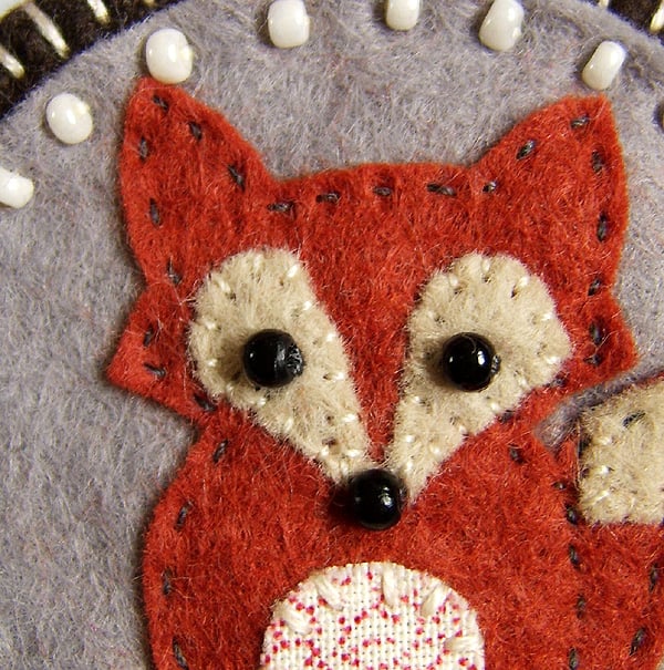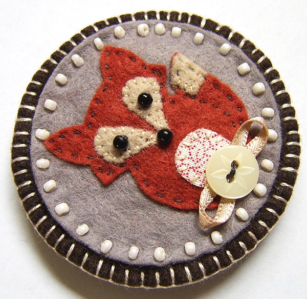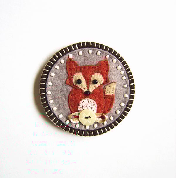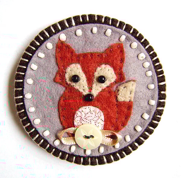 It features a cute little felt fox with applique details. It is mounted onto a circular grey felt base which is edged with pretty cream seed beads. It is further mounted onto a dark brown felt backing and is finished with a little button and ribbon a detail. There is a metal brooch pin on the reverse side for easy attachment.