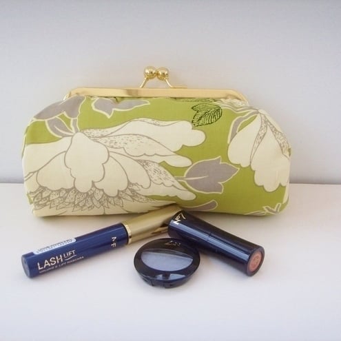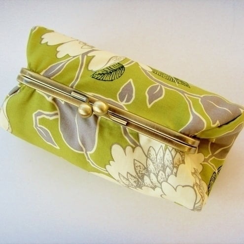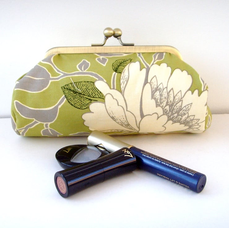 Perfect little clutch for your mobile phone, keys, sunglasses,change and credit cards or even a make-up bag. Pretty Amy Butler Tree Peony fabric with contrasting lining, padding and silver metal frame clasp.