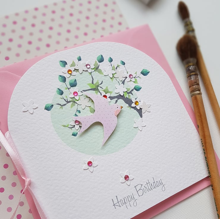 The little bird has been handcut from pastel mauve/pink polka dot card and finished with a sparkly pink cheek and gilded beak. Sparkly and plain card has been used for the blossoms which have been finished off with a sprinkling of diamantes.