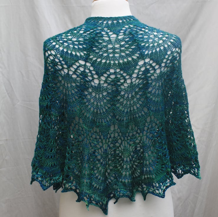 Knitted in a 100% merino sock yarn that is very soft and changes through shades of greens and blues with a lace pattern all over.. The design of this shawl allows it fit around your shoulders very comfortably with no danger of slipping off. There are lots of ways to wear it as shown.