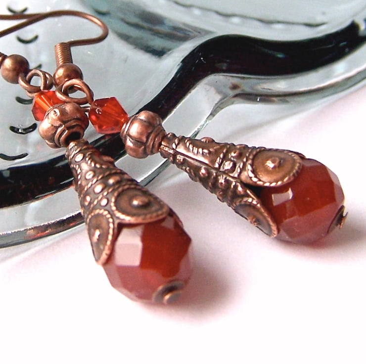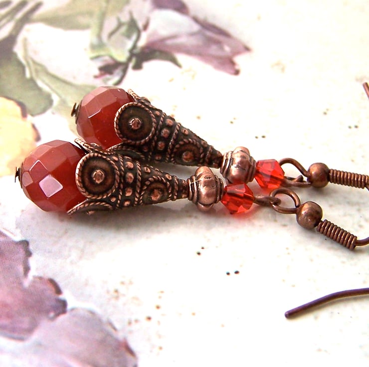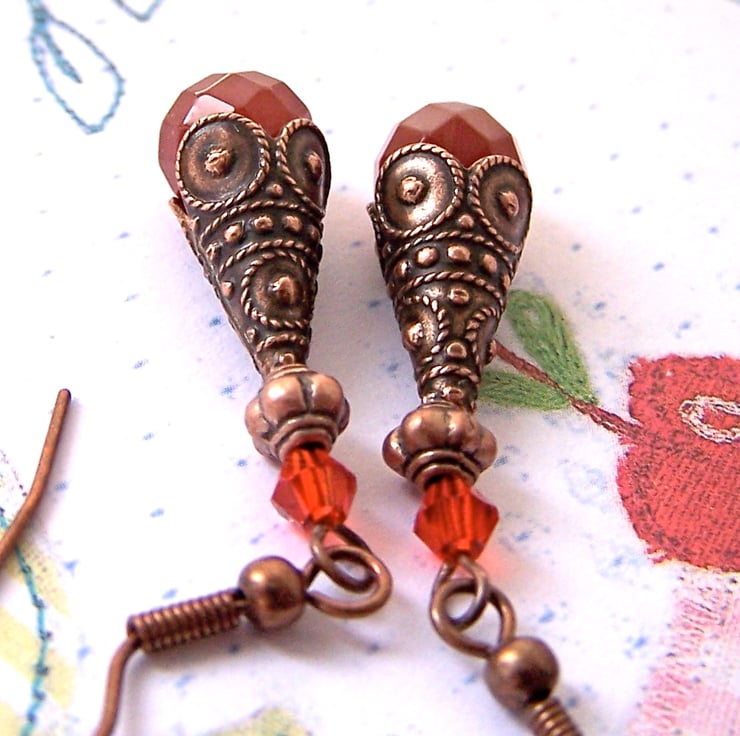 These are beautiful and elegant red earrings made with semi-precious candy jade in a beautiful earthy shade of red, accentuated by fancy Tibetan-style copper bead cones and tiny sparkling swarovski crystals.