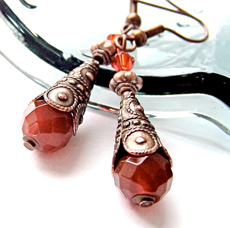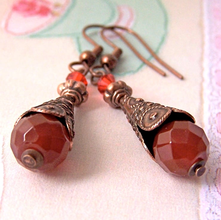 To make these red earrings, I chose two beautiful 8mm candy jade stones, faceted to give them a lovely shine. I finished these with long fancy antique copper effect bead cones and little ridged copper finish beads. A pretty swarovski crystal in a matching shade of red completes the earrings.