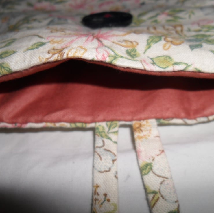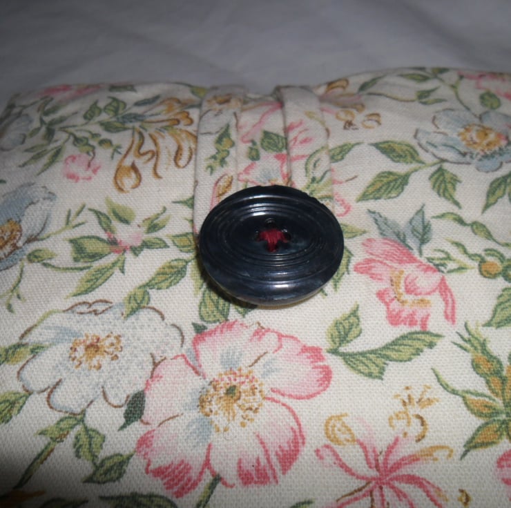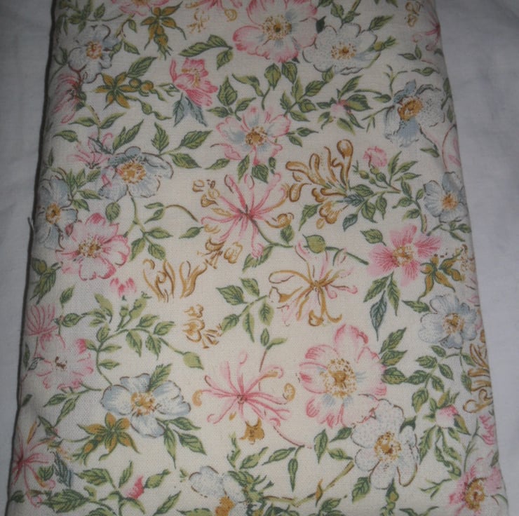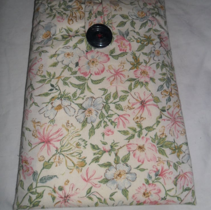 This padded kindle case has been hand sewn. The floral pattern on the outer material is called Honeysuckle and is from the country diary Collection. The floral print is a mix of honeysuckle and dog roses on a cream background. The case is 100% cotton through out including the padding and the brown cotton inner lining. I have used a retro dark green, ridge patterned button and created a material loop to fasten your kindle into the kindle cover.