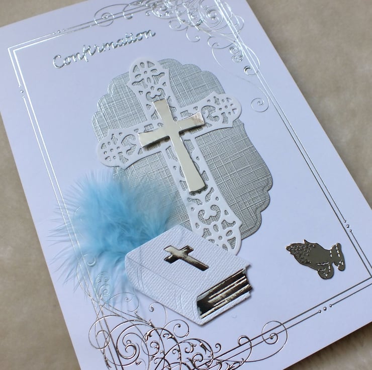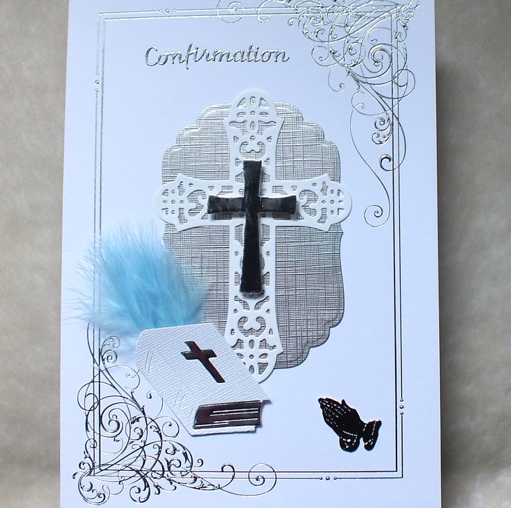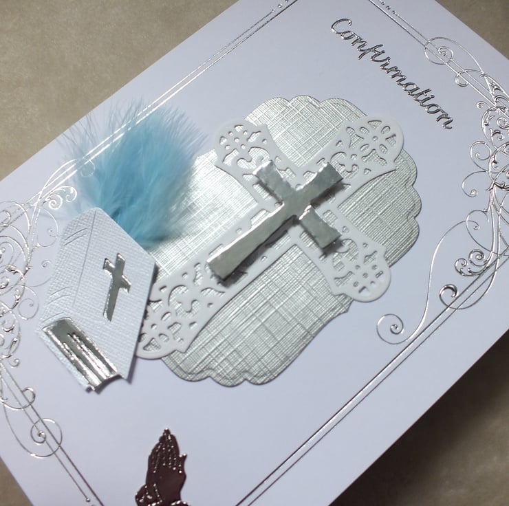 Luxury handmade, size A5, Confirmation card, embellished with cross, praying hands, white Bible and blue marabou feather, with 'Congratulations on your Confirmation' sentiment inside.