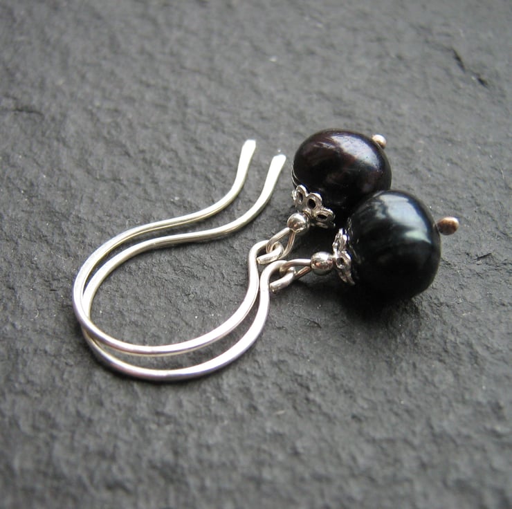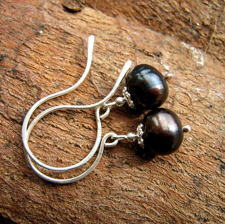 These stunning black potato pearls hang from handcrafted sterling silver ear hooks. The finished earrings measure 32mm total drop length. The simple yet elegant design make these earrings perfect for everyday or evening wear.