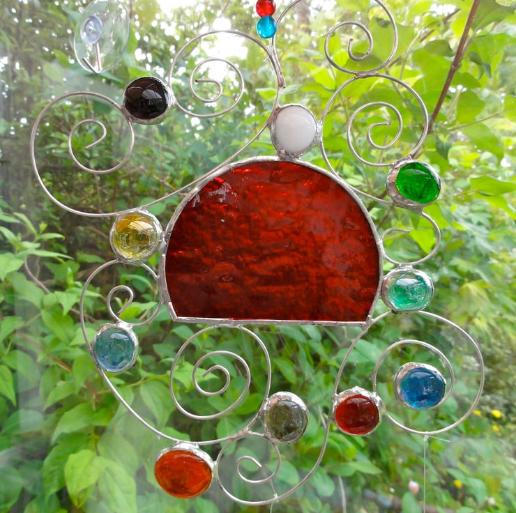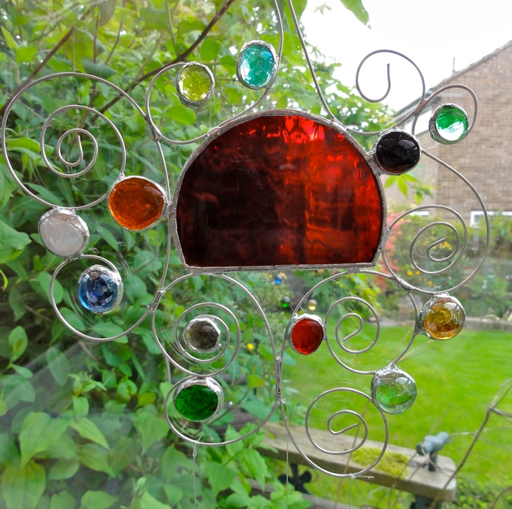 Here is a pretty stained glass mobile which is truly unique.It has been made from beautiful streaky red water glass or red granite backed glass with a selection of coloured glass nuggets.