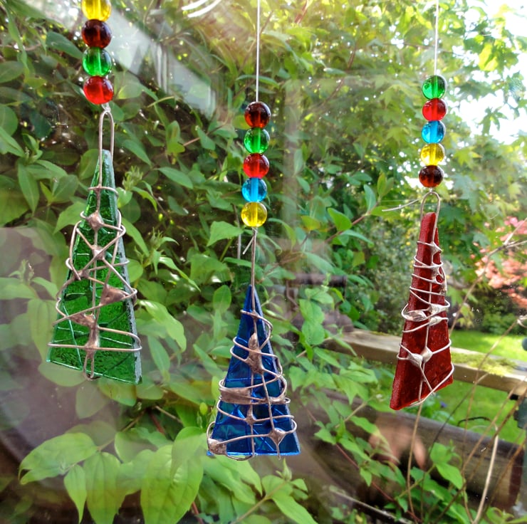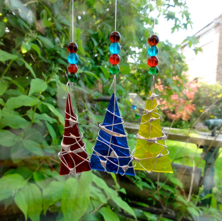 The glass and nuggets have been copper foiled and soldered with curled wire, three triangles of glass in red, blue and yellow on the first mobile and green, blue and red on the second which hang from the mobile which have been wrapped with wire and soldered for added detail, each triangle hangs from a beaded length of line.