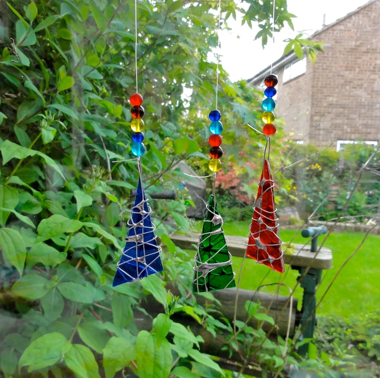 The glass and nuggets have been copper foiled and soldered with curled wire, three triangles of glass in blue, green and red on the first mobile and green, blue and red on the second which hang from the mobile which have been wrapped with wire and soldered for added detail, each triangle hangs from a beaded length of line.