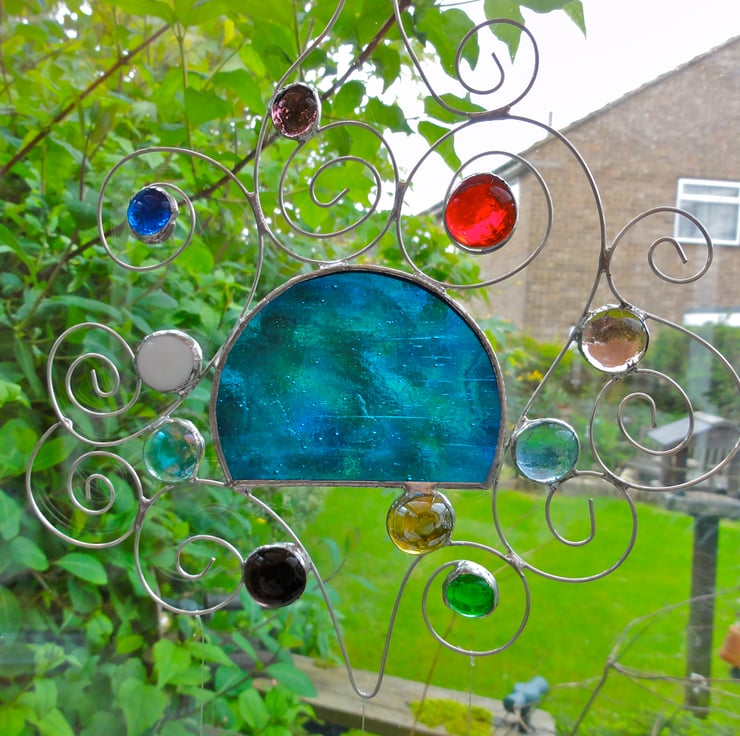 Here is a pretty stained glass mobile which is truly unique.It has been made from beautiful two but streaky glass which looks turquoise with a selection of coloured glass nuggets.