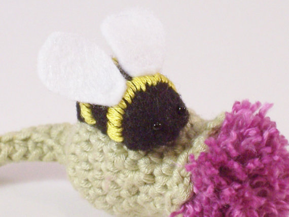 Crochet thistle in cotton yarn, with embroidered and beaded felt bumblebee.