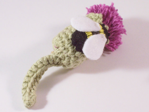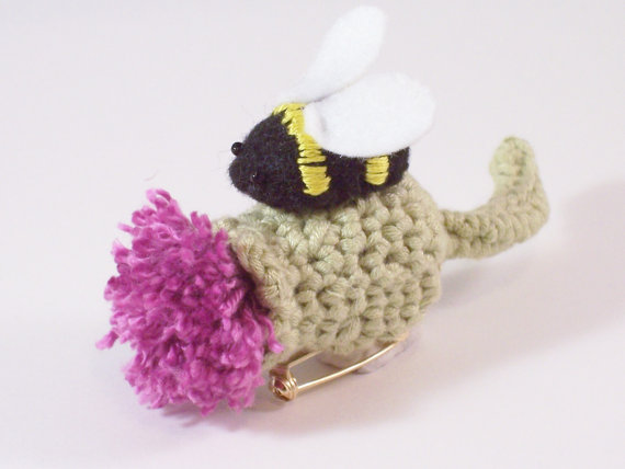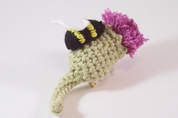 The thistle is crocheted in cotton yarn and stuffed with fibre fill, whilst the "flower" is carefully fluffed after securing in place . A hand sewn and embroidered felt bumble bee is then stitched on before a brooch pin is attached to the back.