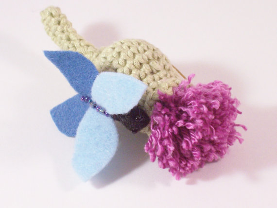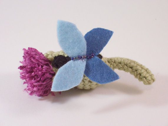 The thistle is crocheted in cotton yarn and stuffed with fibre fill, whilst the "flower" is carefully fluffed after securing in place . A hand sewn and embroidered felt butterfly is then stitched on before a brooch pin is attached to the back.