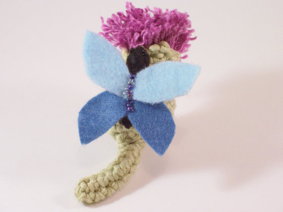 Crochet thistle in cotton yarn, with embroidered and beaded felt butterfly. Hand sewn, with glass beads, each butterfly is unique.