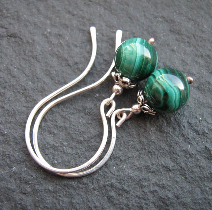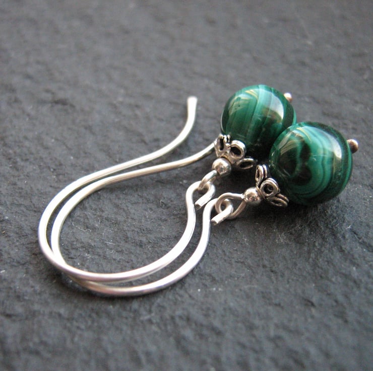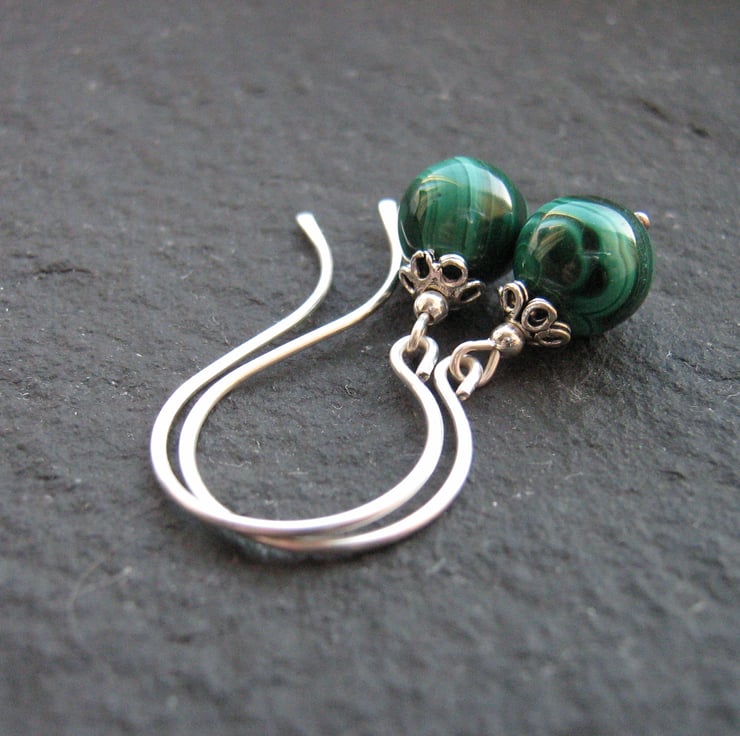 Stunning deep green beads of Malachite hang from handcrafter sterling silver ear hooks which have been heated and shaped before polishing back to a shine. All metal parts are sterling silver, and overall drop length is approximately 31mm.
