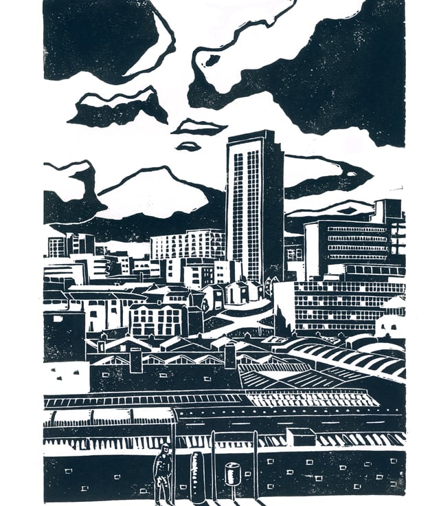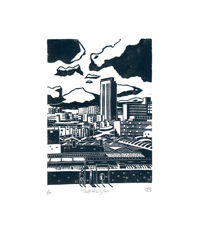 A hand-printed linocut print entitled 'Sheffield City View'.