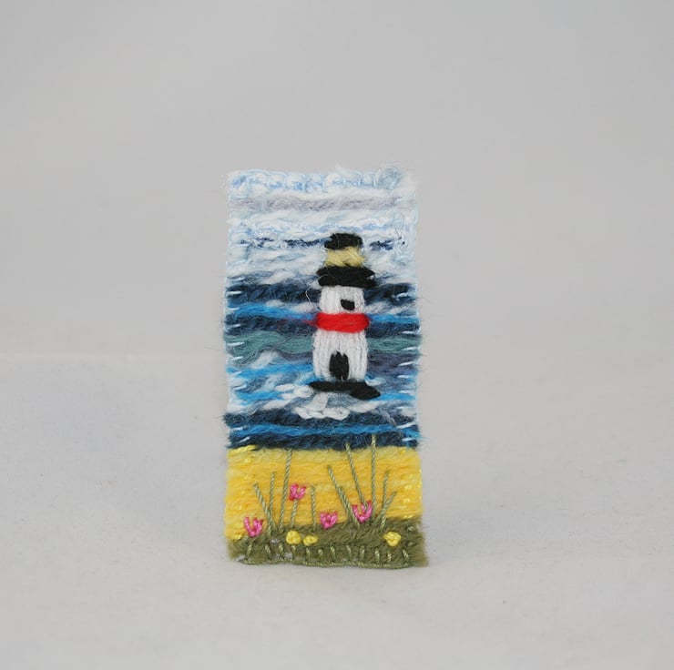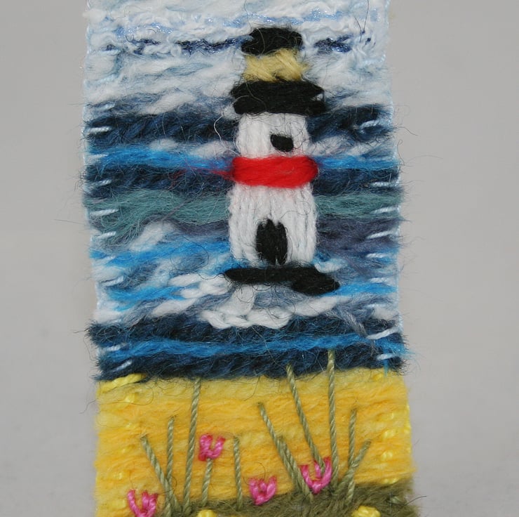 This textile brooch, on a felt backing, features a lovely summer, seaside theme of a lighthouse, beyond the beach, felted and hand- embroidered.