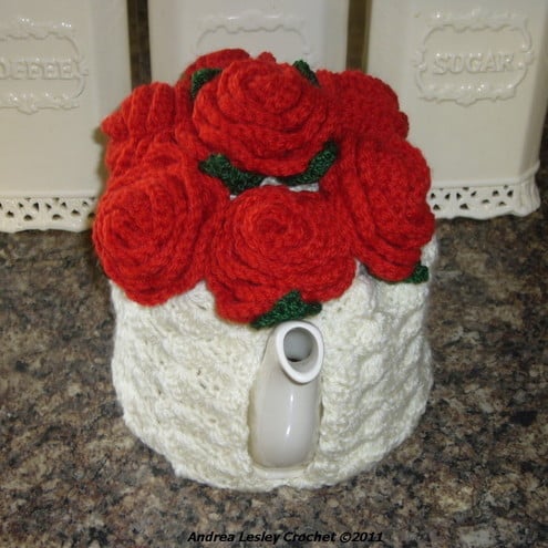 The cosy has been handmade using good quality yarn in cream. The top of the cosy is decorated with seven individual roses in bright red with dark green leaves.