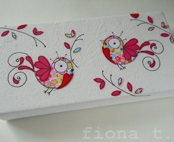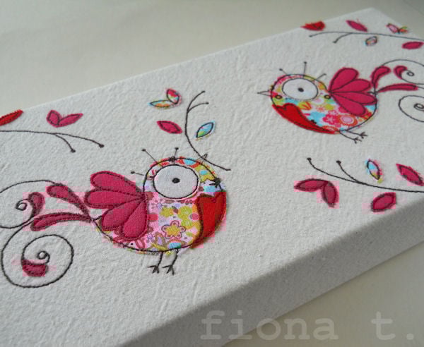 the birds are in floral cotton fabrics, with bright red hearts on their chests, and pink wing and tail feather details. the same fabrics are used for the tiny leaves which decorate the branches.