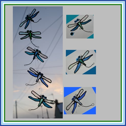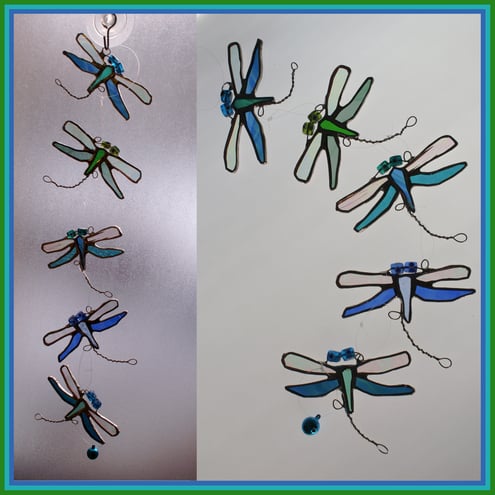 Each dragonfly is individually made from different textures and colours of glass and are all different. 2 in blue-green shades, 1 in turquoise, 1 green and the other blue. They all have 2 wings in iridescent glass so that the wings shimmer in the light as real dragonflies do.