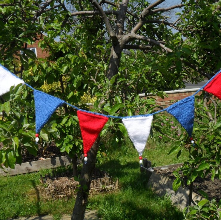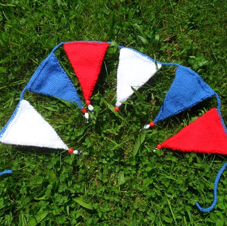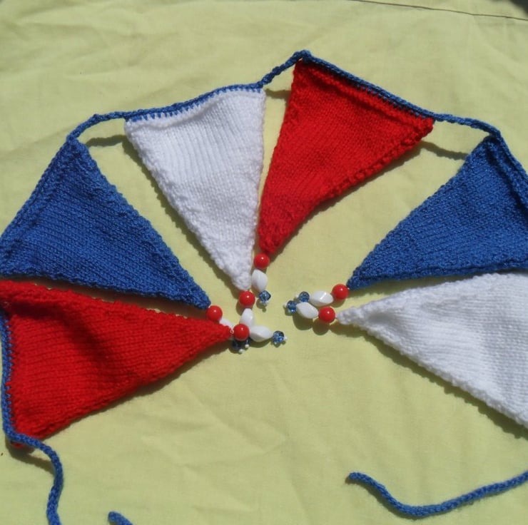 Hand knitted Triangle style red, white and blue bunting knitted in 100% Acrylic yarn. Each bunting triangle flag is made from two individually hand knitted piece's sewn back to back. I have then crocheted the triangle along the top to form the bunting string. At the point of each triangle I have sewn a red, white, bead and white bead tassel.