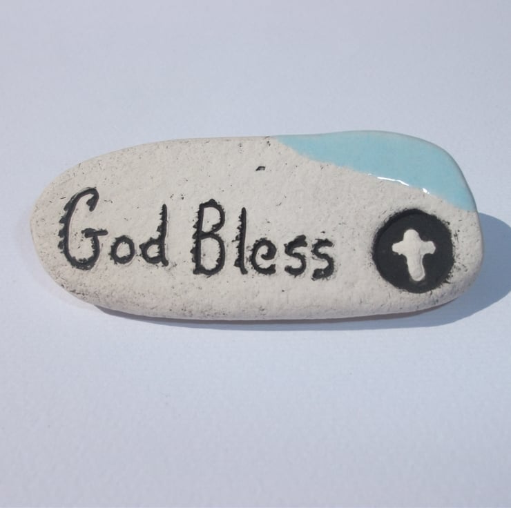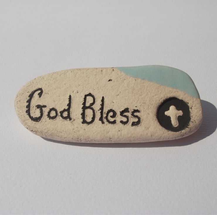A small handmade ceramic stone with the words GOD BLESS inscribed into it to help celebrate a little one's birth, Baptism or Christening, a First Communion or a teenagers Confirmation. I have other items in my shop that would make lovely gifts too.