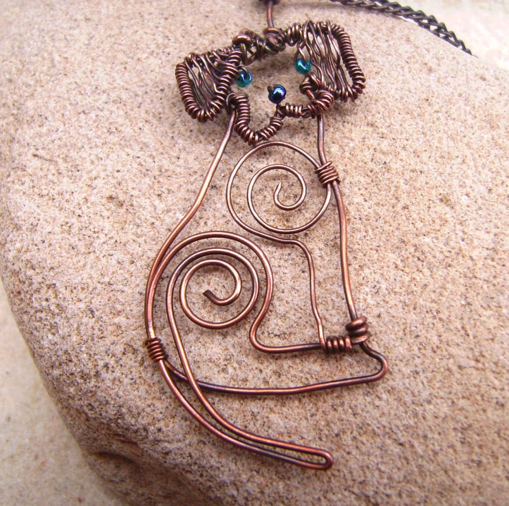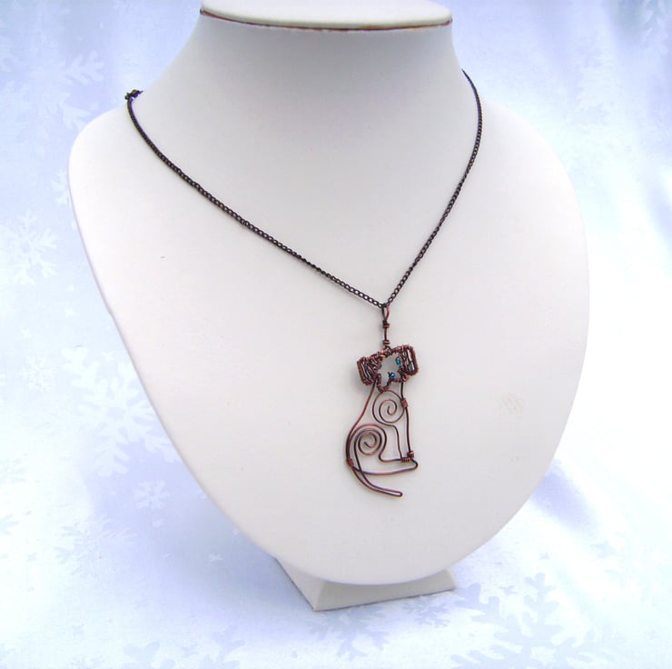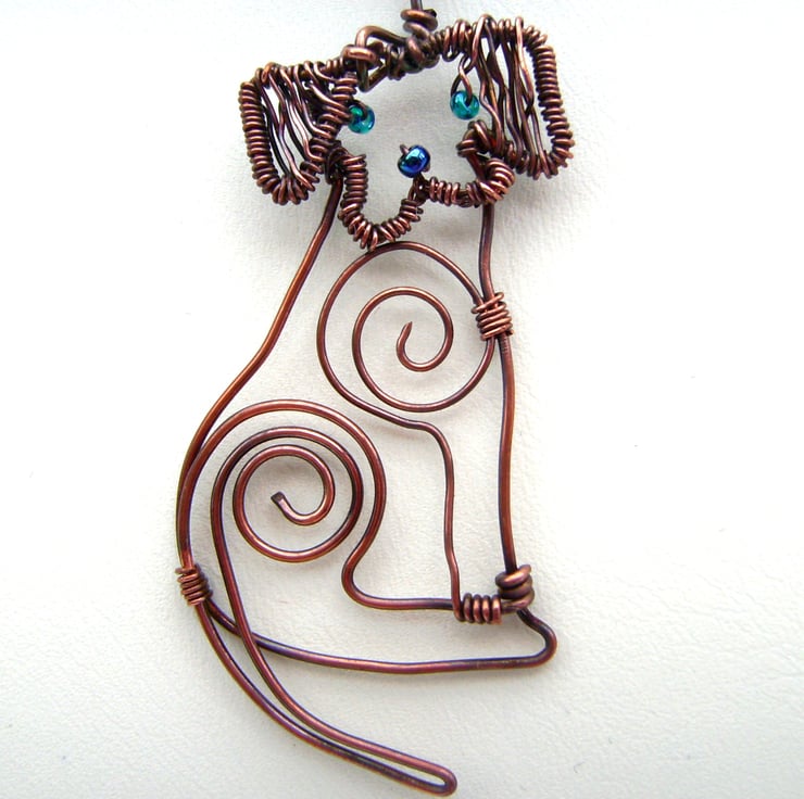 This cute little copper wire dog has been shaped by hand & with pliers & then oxidised & polished. Being oxidised means she will not tarnish much. Seed beads form her nose & eyes. She is approximately 5 x 2 cm in size & has been hung on a 17 inch (43 cm) copper tone chain. She will be sent in a gift box. She would love a new home to care for her & is no trouble as she doesn't need feeding or toilet training!