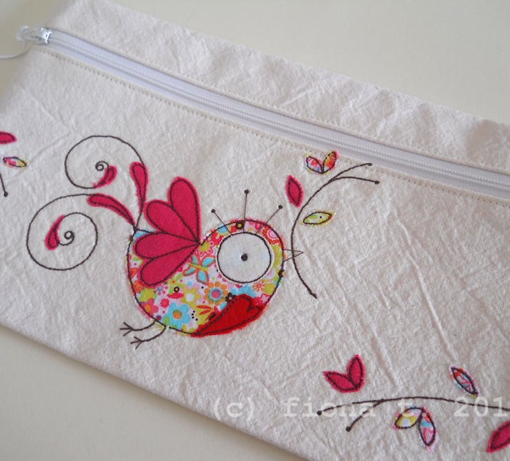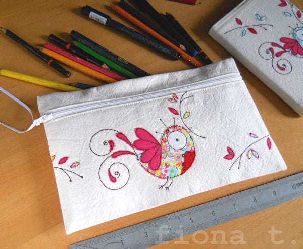 the pencil case itself is made from heavy weight calico which has been pre-washed so it’s soft and should not shrink. the front is stiffened with vilene, it’s lined with red cotton and has a zip fastening.