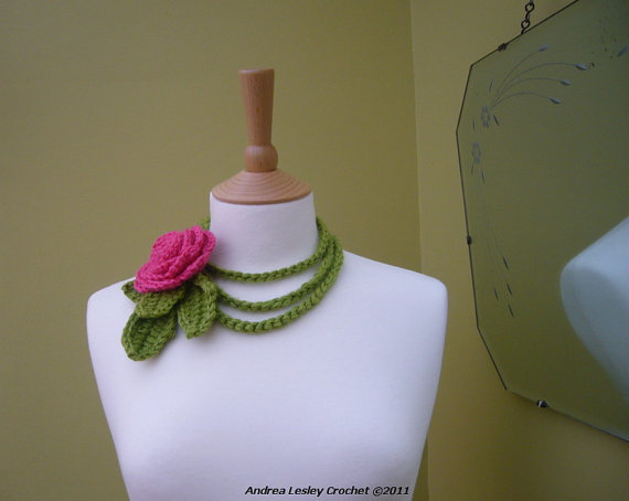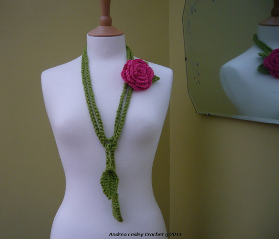 This is a lovely lariat scarflet in green and bright pink.The lariat is crocheted in a lovely green chunky braid in a bamboo wool -mix yarn and decorated with a beautiful bright pink rose and green leaves. The scarf measures approximately 83 inches in length so it can be wrapped around the neck loosely. This is a very versatile scarflet and can be worn in several different ways as shown.