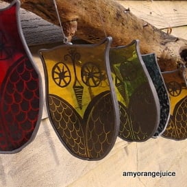 I started making these back in October 2011, the first was a custom make for a birthday present and they have been flying out of galleries and my other online shops ever since! First I cut the glass then I paint on the design with traditional kiln fired stained glass paints. I use a sharp stick to scrape the paint away and reveal the glass and then I put it in the kiln to fix to the glass, when it comes out I wrap the edges in lead and give them a good polish.