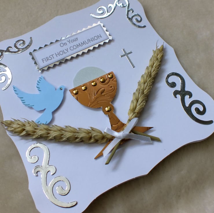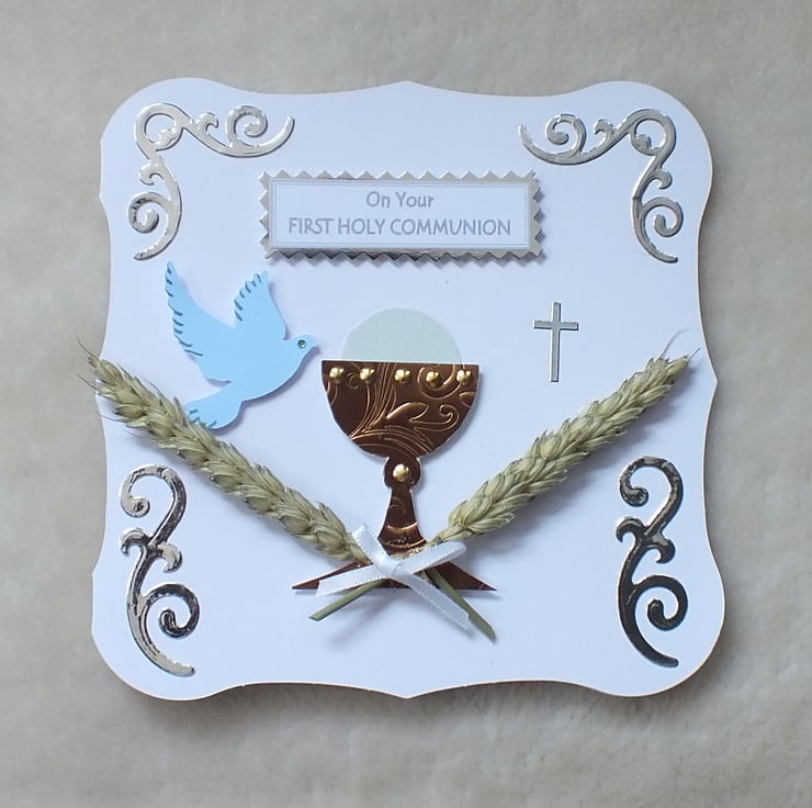 Luxury handmade, 1st Holy Communion card, size 6"x6", embellished with flourishes, chalice, holy sacrament, blue dove, silver cross, tied wheat sheaves, and 'On Your First Holy Communion' sentiment. Blank inside.