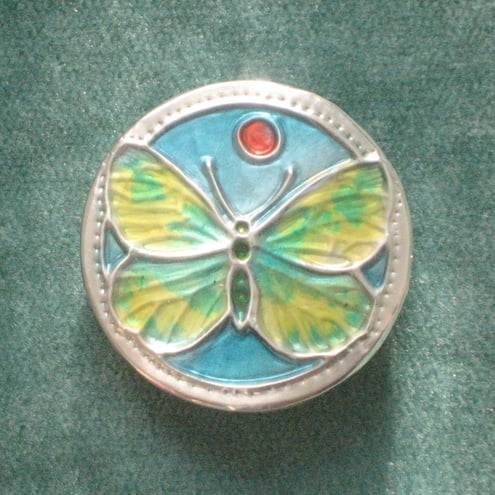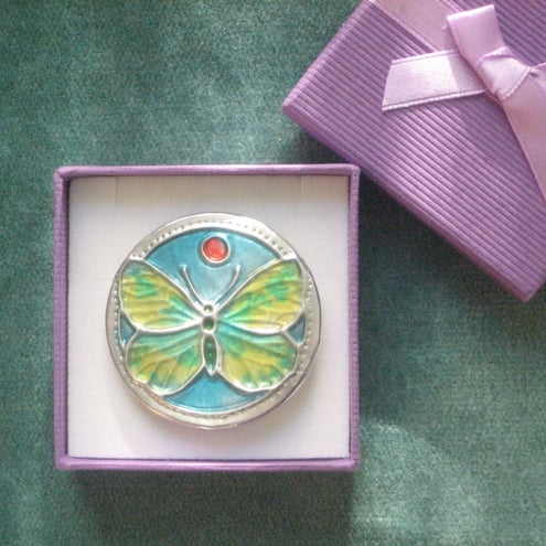 Was £16.00, now £14.00. This colourful brooch has been hand-made in modern lead-free pewter and painted with cold enamels.It measures 45mm in diameter and has a 25mm pin on the reverse. Light in weight, it comes in an attractive gift box