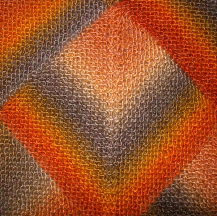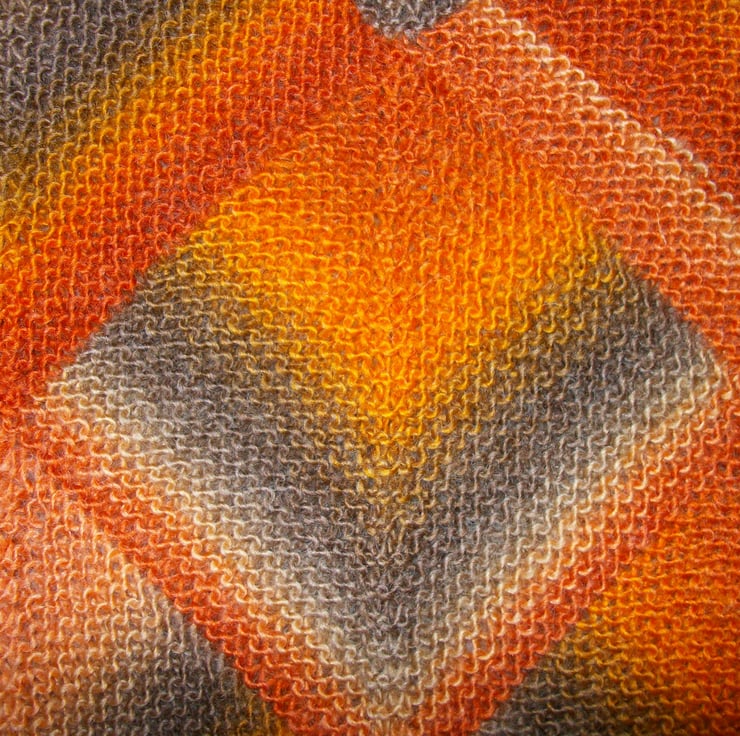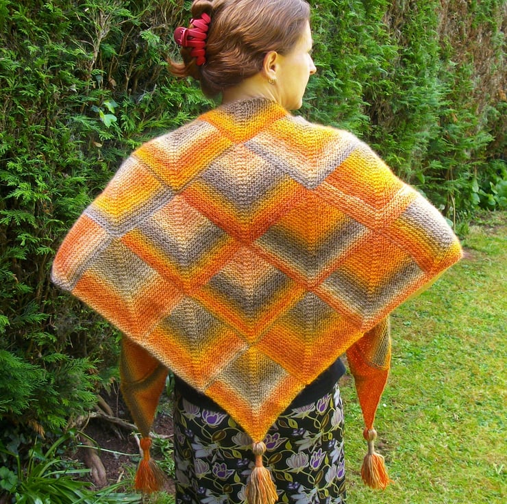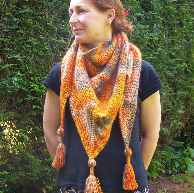 This is a pattern for a triangular shawl I have designed for you to knit. The shawl measures 61” point to point, and 26” deep. It uses 3 x 100g balls of King Cole Riot DK (30% wool, 70% acrylic) 294m per 100g, or an equivalent DK yarn. The finished garment weight is 250g approximately.