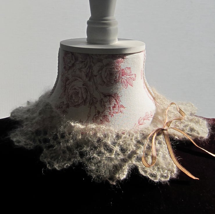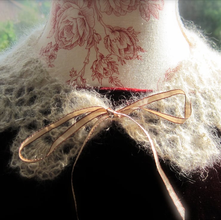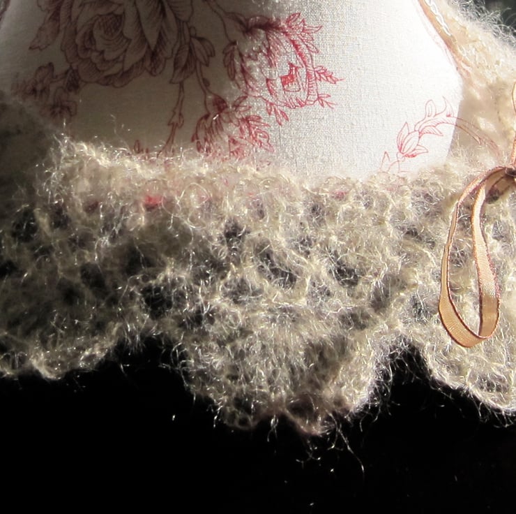 A delicate hand crocheted collar, great for dressing up a sweater or cardigan, or you could wear it like a necklace. A fine metallic yarn adds a glamorous glint.