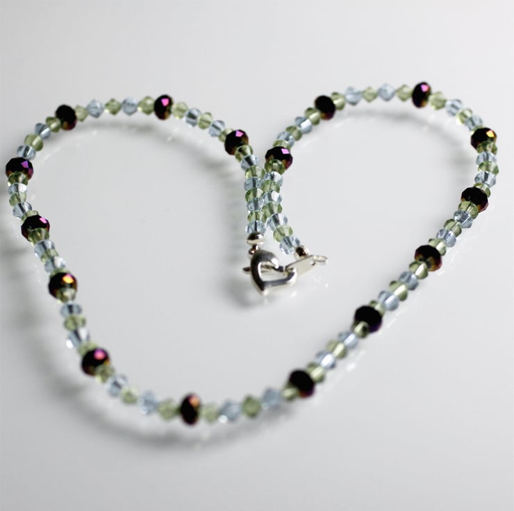 This necklace s made from purple iris multi-faceted crystal beads interspersed with pale green and pale purple clear bi-cone crystal beads and is approximately 44 cm in length.