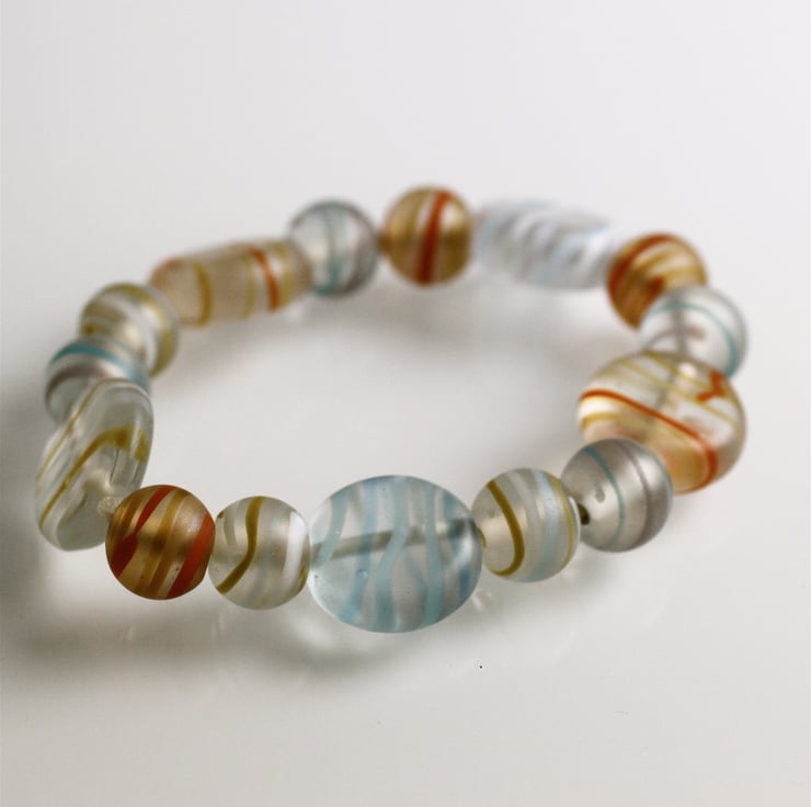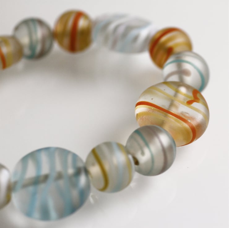 This is a simple yet effective bracelet made from beautiful frosted glass beads decorated with different coloured stripe patterns - blues and oranges. The bead range from 1-1.5 cm approx and are a variety of shapes.