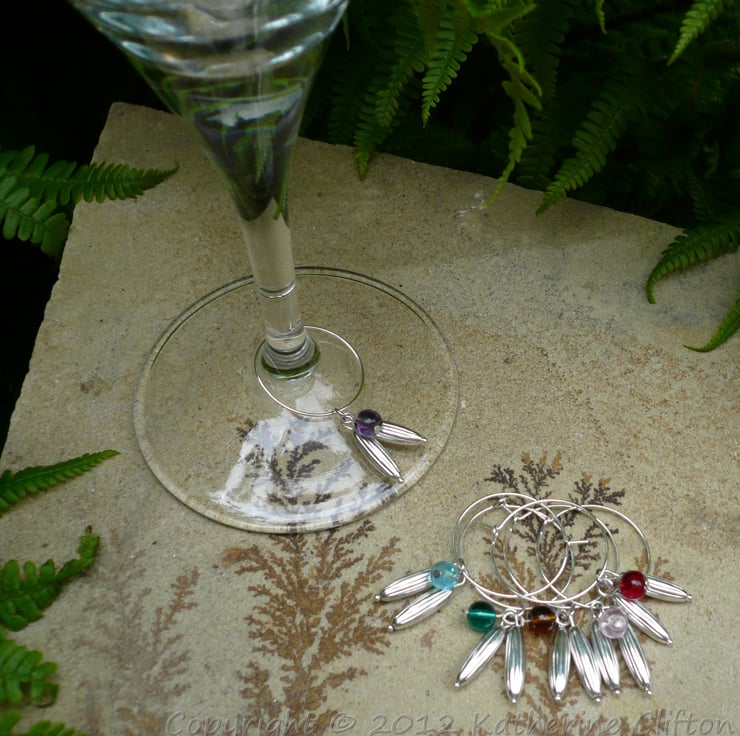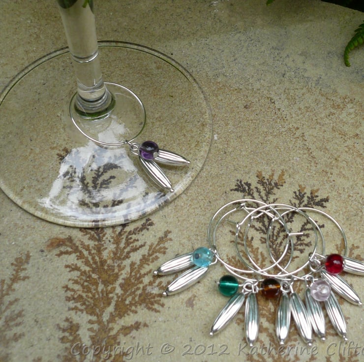 This set of wine glass charms is made up of silver plated corrugated oval melon beads with glass beads in purple, pale blue, brown, pale pink, red and teal; and attached to 25mm silver plated rings.