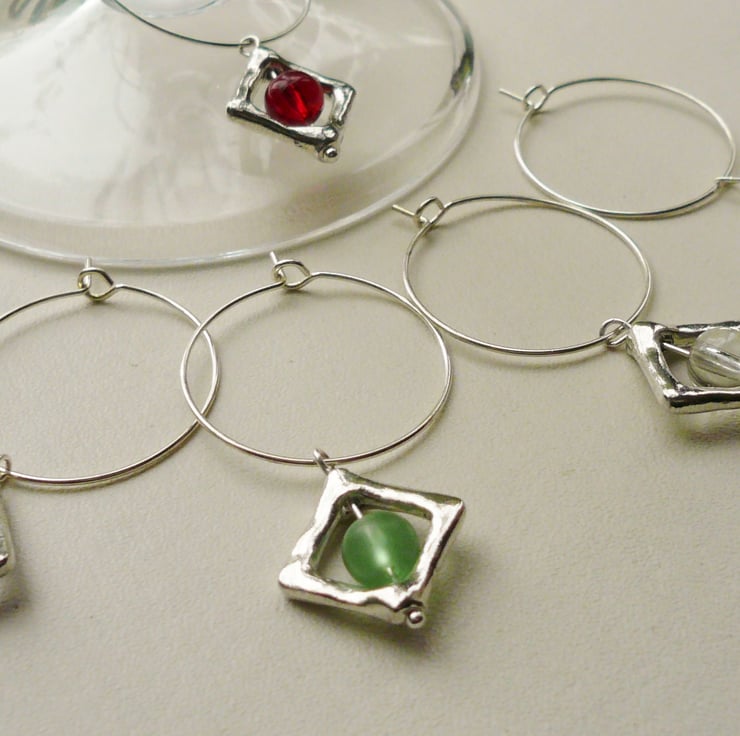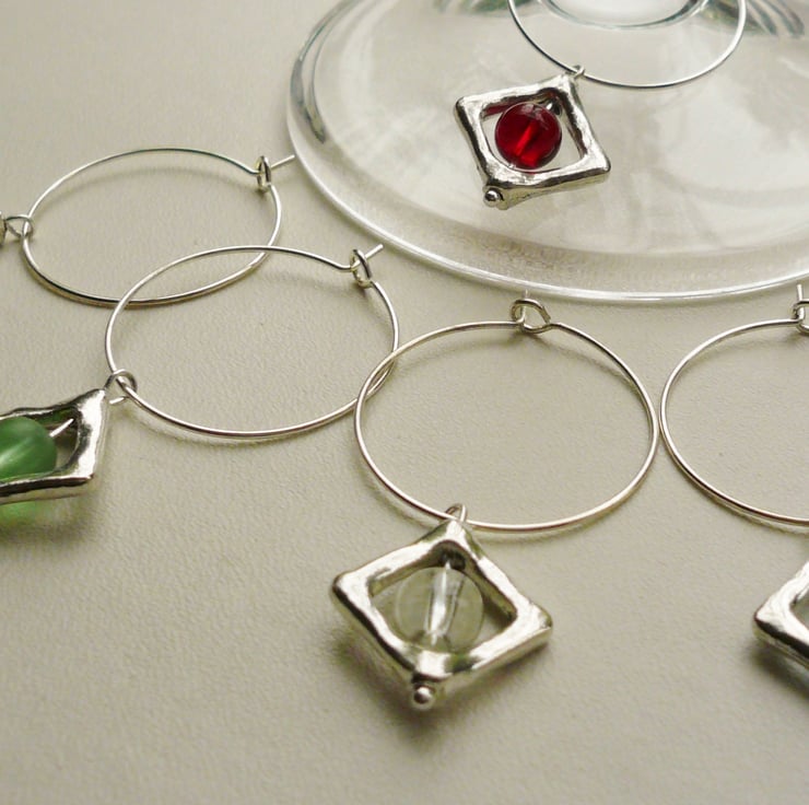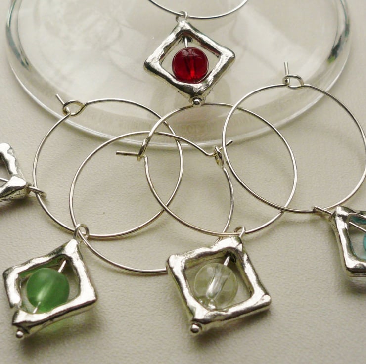 This set of five wine glass charms is made up of 10mm Tibetan silver hollow diamond bead frames with 5mm round glass bead insert in pale green, clear, red, pale blue and purple; and attached to 25mm silver plated rings.