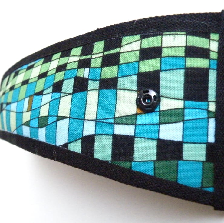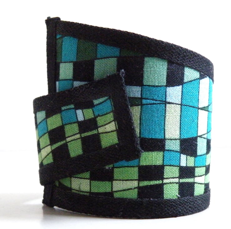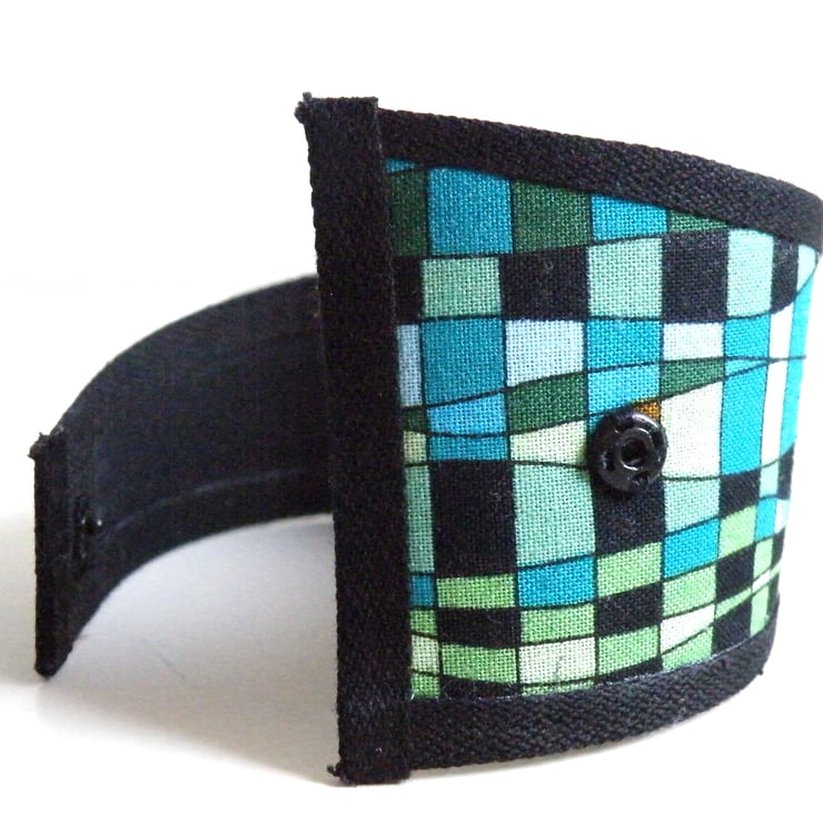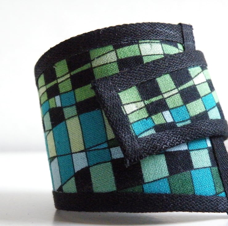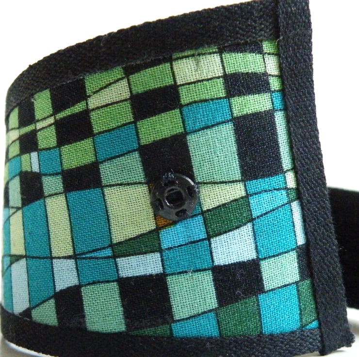 It is made with cotton and has a snap fastener. It is in total 18cm/7.1inches long. You might want to measure your wrist before ordering but it is a fairly standard size.