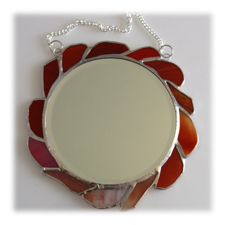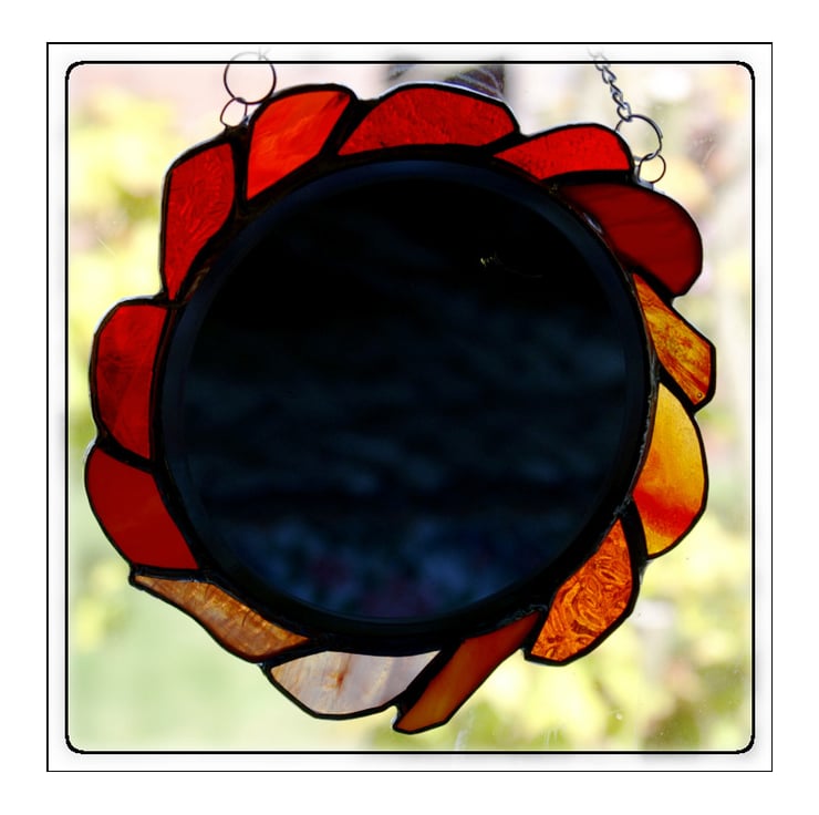 I have used a 13cm round mirror and encircled it with 13 pieces of glass in gorgeous shades of sunset, of reds and ambers, to make a wave border round the mirror.