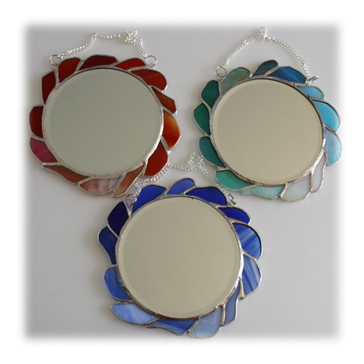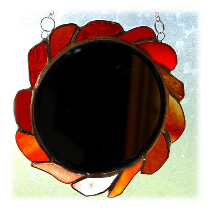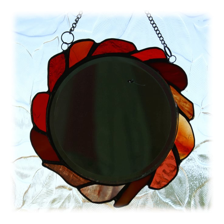 This is a stained glass mirror made using the Tiffany copper foil technique.