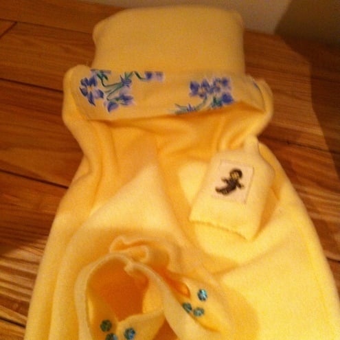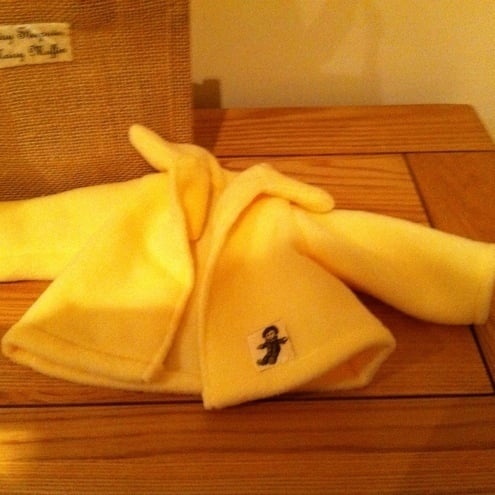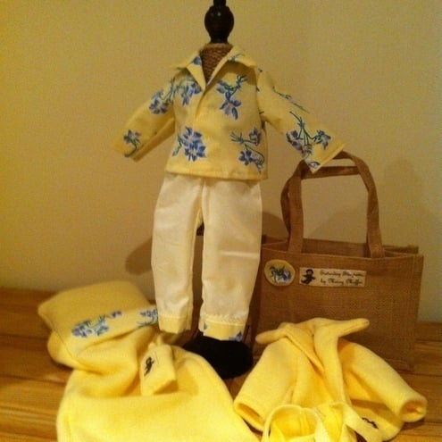 The perfect gift for Christmas! 'Bags of Style' for Maisy Muffin dolls. A little jute bag full of goodies to create a play scene. The one here is called 'Saturday Sleepover'. The set contains a yellow fleece ready bed trimmed with cotton fabric. Yellow and blue flowered pyjamas, yellow fleece slippers, decorated with pretty blue sequins, a hot water bottle and a yellow fleece dressing gown jacket. All a little girl needs to take her Maisy Muffin