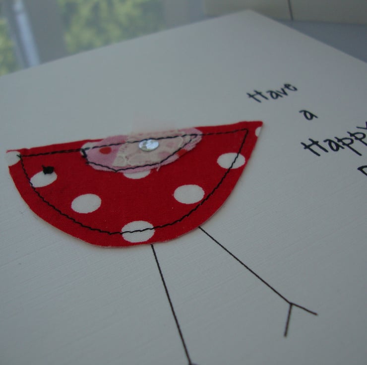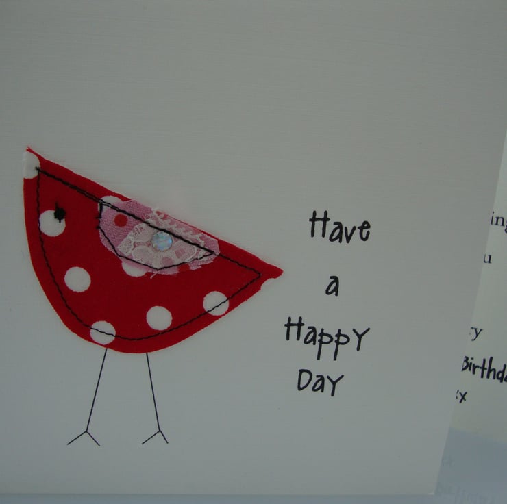 A cheeky little bird has been free machined onto white card to wish you a happy birthday.