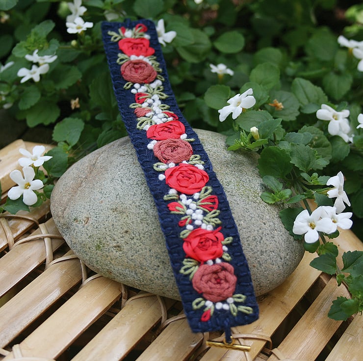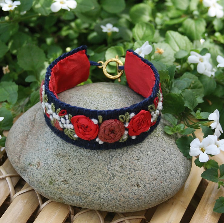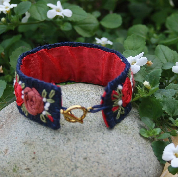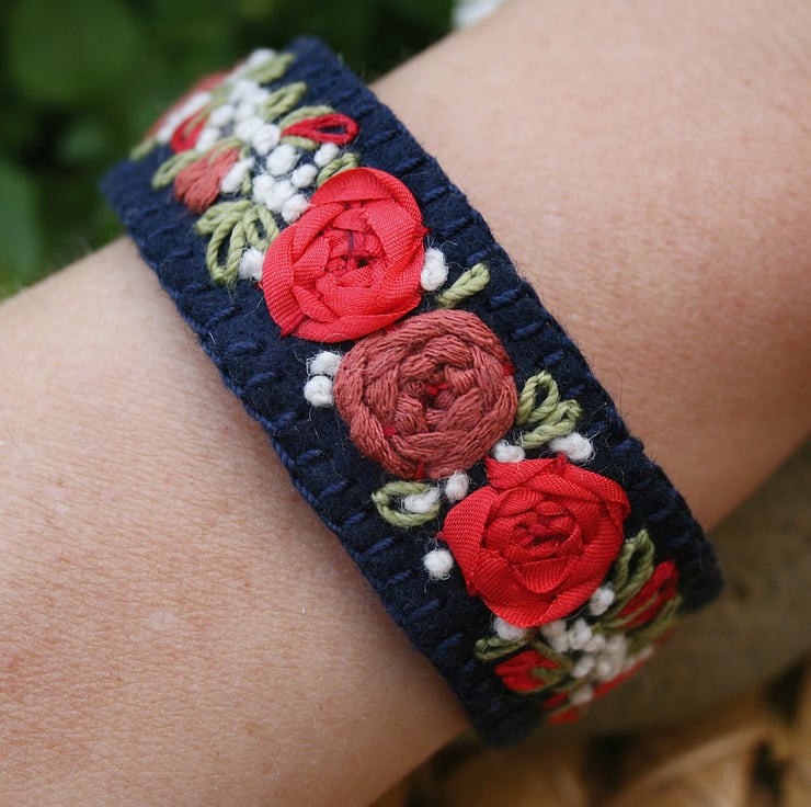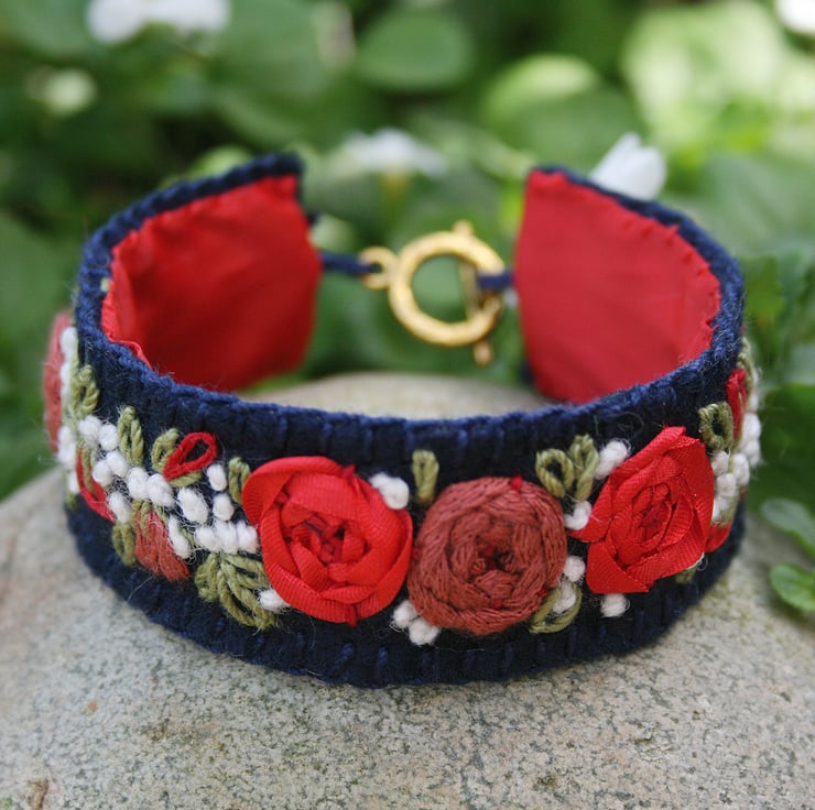 Beautiful red roses, in a cloud of white gypsophila, have been embroidered on a navy blue, felt background. The bracelet is edged in blanket stitch, in navy blue, lined with red ribbon and closes with a toggle clasp. A Valentine's gift perhaps?